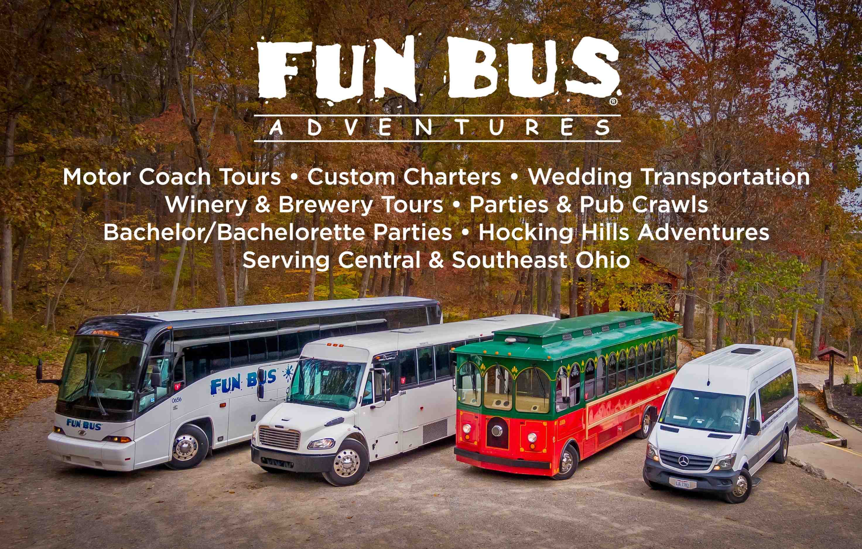 Fun Bus Adventures is Central and Southeast Ohio’s trusted transportation and travel experience provider, delivering safe, dependable, and unforgettable journeys for groups of every size. Whether you’re planning a wedding, organizing a corporate outing, booking a charter, or joining one of our exciting scheduled trips, we make travel easy, comfortable, and fun from start to finish. From nostalgic wedding trolleys to luxury motorcoaches and versatile sprinter vans, our diverse fleet ensures the perfect ride for every occasion.